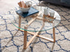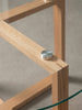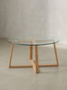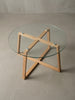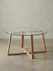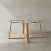Couchtisch in Eiche mit transparenter Glasplatte und überkreuztem Gestell, modernes Design