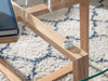 Das Untergestell des Couchtisches besteht aus massivem Eichenholz mit einer markanten Holzmaserung. Diese verleiht dem Tisch eine natürliche und warme Ausstrahlung, die zu einem gemütlichen Ambiente beiträgt.