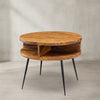 Couchtisch aus Sheesham Massivholz, Rund mit 4 Ablagefächern, Gestell aus Schwarzem Metall