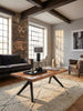 Der Couchtisch steht stabil aufgrund des massiven Metallgestells. Dadurch wird eine sichere Nutzung gewährleistet und mögliche Wackeln oder Verschieben des Tisches vermieden. Das Gestell ist schwarz matt und bildet einen modernen Kontrast zur braunen Tischplatte.