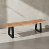 Das rustikale Design dieser Bank wird durch die natürlichen Unebenheiten des Akazienholzes geprägt, die ihr einen einzigartigen Charme verleihen. Die robusten Metallfüße in schwarzer Triangelform sorgen für Stabilität und geben der Bank ein modernes Aussehen.