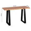 Dank der hochwertigen Materialien ist der Konsolentisch besonders langlebig. Die unbehandelte Akazienholz-Tischplatte weist eine einzigartige Maserung auf und wird von starken Beinen aus lackiertem Eisen getragen. Diese Konstruktion ermöglicht eine Belastbarkeit von bis zu 70 kg und verhindert ein Umkippen des Tisches.