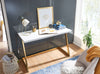 Der Tisch verfügt über ein stabiles und lackiertes Metallgestell in Gold, das für einen sicheren Halt sorgt. Mit einer empfohlenen Maximalbelastbarkeit von 50 kg können Sie problemlos Ihren Computer, Ordner und andere Arbeitsutensilien auf dem Tisch platzieren.