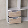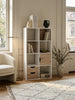 Mit insgesamt 8 Fächern, inklusive 2 mit Sichtblende auf der Rückseite, bietet das Regal viele Ablagemöglichkeiten für Bücher, Dekorationsartikel und andere persönliche Gegenstände. Zudem verfügt es über 2 Schubladen und ein Türfach, die ebenfalls mit Sichtblenden ausgestattet sind.