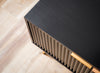 - Lowboard: folierte Spanplatte in schwarzer Eiche-Optik