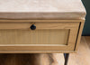 - MATERIAL: Korpus: folierte Spanplatte in Eiche-Optik // Sitzflächenbezug: Stoff (100% Polyester) // Geflecht: Polyrattan // Griffe und Beine: pulverbeschichtetes Eisen