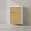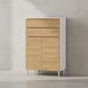 Badschrank Weiß und Eiche Grandson 60x97x34 cm mit Schubladen, Chromfüßen und griffloser Front VEER